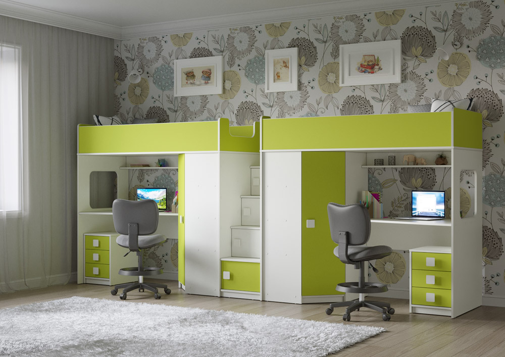 Две кровати, два шкафа, две рабочих зоны с тумбами – одна лестница. Идеальный вариант для двоих детей!